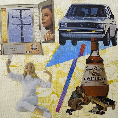 Cerussite. Mixed media collage on canvas with paint and original vintage ephemera. 36 x 48 inches. 2017.